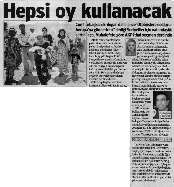 Yine aynı gün bu haberin iç sayfalardaki devamında da ‘iradesiz’ Suriyelilere vurgu yapıldığını, vatandaşlığın aslında Erdoğan’ın başkanlığı için verilmek istendiğini okuyoruz. Tamamen muhalefetin iddialarının yer aldığı bu haberde, CHP Genelbaşkanı Başdanışmanı Erdoğan Toprak’ın ayrımcı açıklamalarına da yer verilmiş: