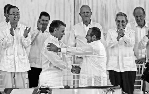 26 Eylül'de sömürge dönemi Karayip kenti olan Cartagena de Indias'ta ayrıntılı şekilde sahnelenmiş imza töreninde Kolombiya Devlet Başkanı Juan Manuel Santos ile Kolombiya Devrimci Silahlı Güçleri FARC'ın lideri Timoşenko lakaplı Rodrigo Londoño Echeverri ülkenin 52 yıllık iç savaşının sona erdiğini duyurdu.